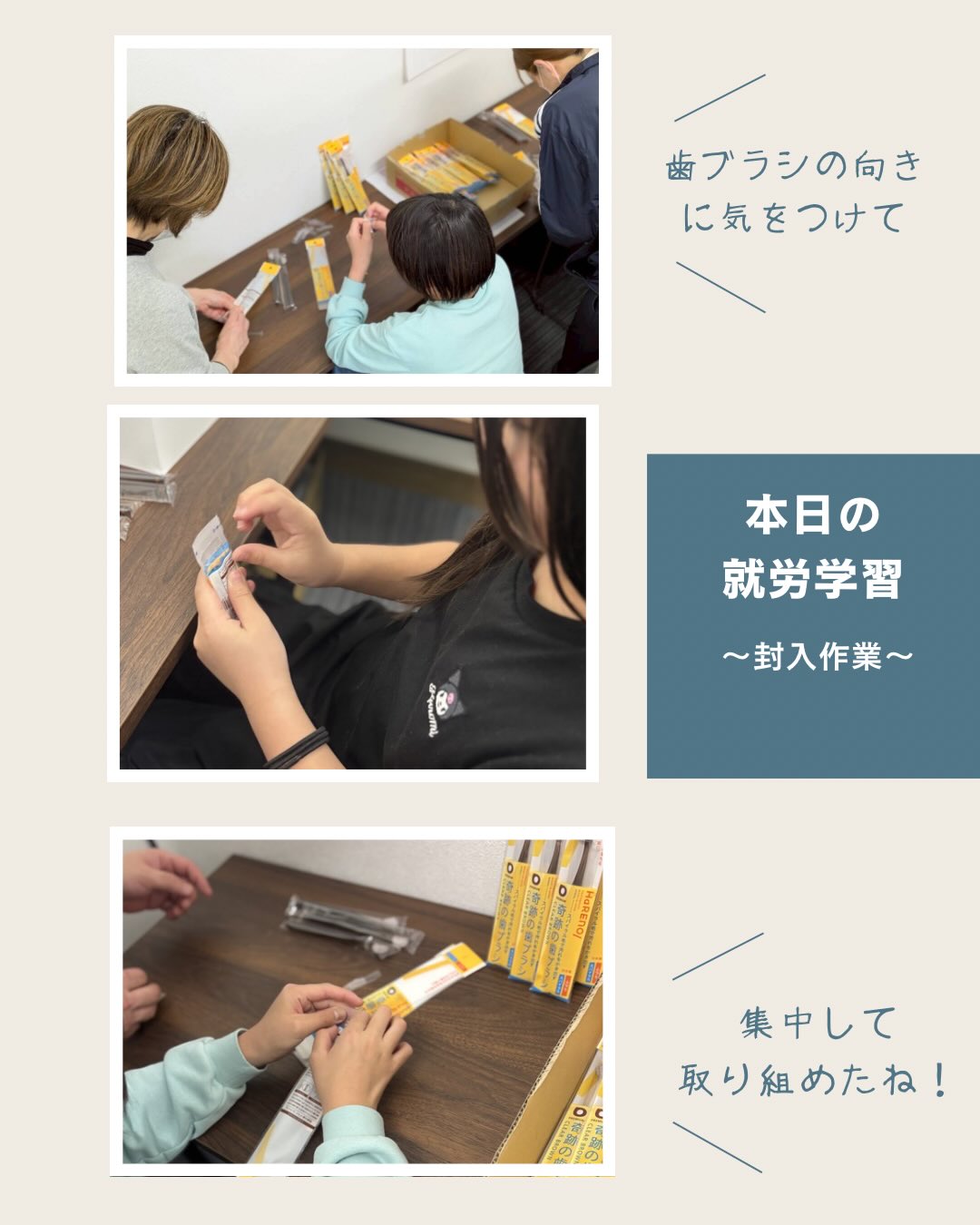歯ブラシの向きや封入する際のラインの位置など一つひとつ丁寧に確認しながら、コツコツ作業する力や集中力を育んでいます👏